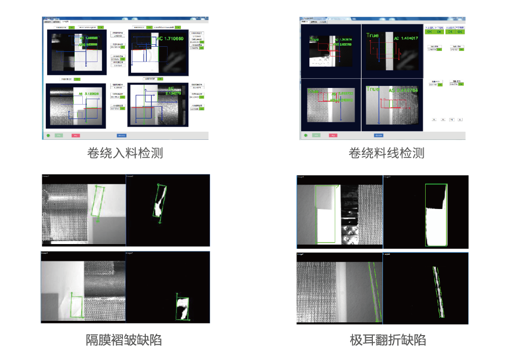 卷繞機是鋰電池成型的主要設(shè)備,通過驅(qū)動卷針將正負極片和隔膜按照特定的次序卷繞從而形成電芯,在此過程中,需使用視覺進行對齊度糾偏,同時識別相機視野范圍內(nèi)的涂布、隔膜缺陷,以保證產(chǎn)品質(zhì)量。我司采用KINOVISION視覺檢測平臺對卷繞過程中的陰陽極距離和整體電芯的尺寸進行檢測,同時創(chuàng)新采用深度學習相關(guān)算法,實時檢測涂布和隔膜的各類缺陷,提升產(chǎn)品質(zhì)量,該方案已批量應(yīng)用于鋰電客戶。